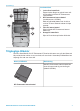 - (fortsättning) Inre batterifack 1 2 3 4 Lucka över batterifack Öppna luckan längst ner på skrivaren när du ska sätta in tillvalet HP Photosmarts interna batteri. HP Photosmarts interna batteri (modellnummer: Q5599A) Med ett fullt laddat batteri kan du skriva ut cirka 75 foton. Batteriet måste du köpa separat. Fack för internt batteri Sätt in tillvalet HP Photosmarts interna batteri här. Knapp för batterifack Skjut ut för att lossa på luckan till facket.