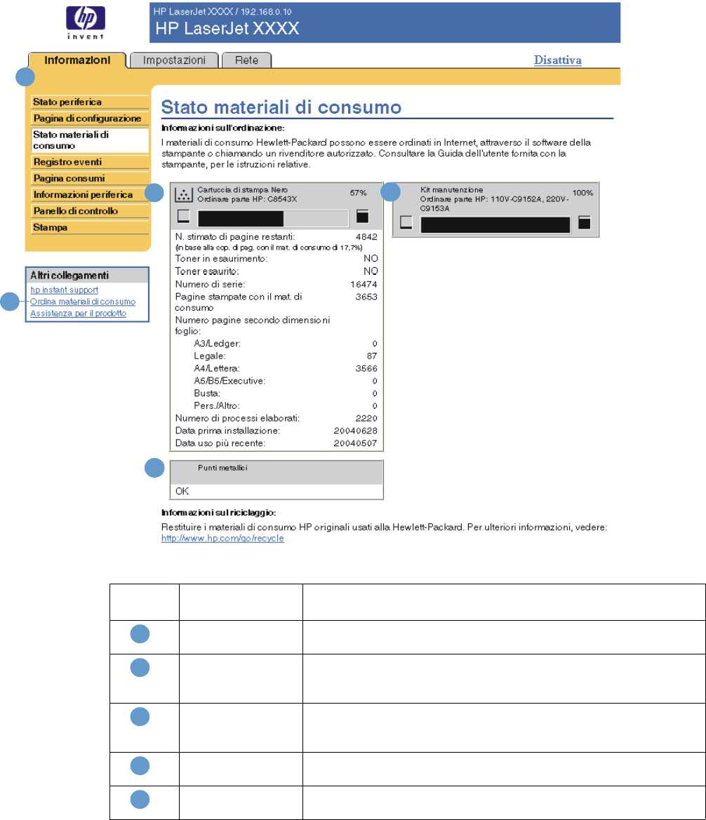 consumo e fornisce i numeri di catalogo dei materiali originali HP. Al momento dell'ordinazione