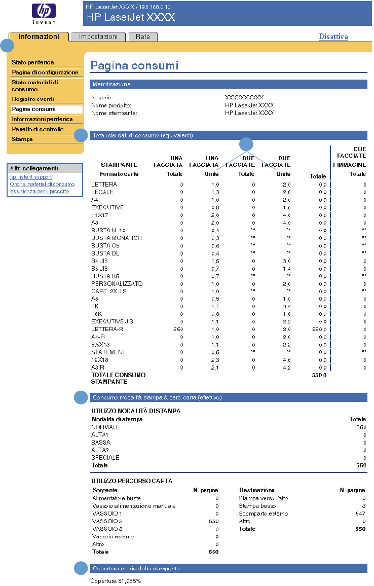 La schermata Pagina consumi fornisce il conteggio delle pagine per ciascun formato dei supporti