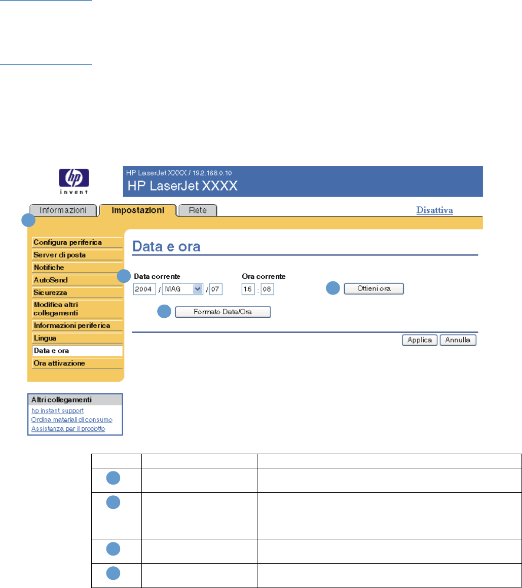 Utilizzare la schermata Data e ora per aggiornare l'ora del prodotto. L'illustrazione e la tabella