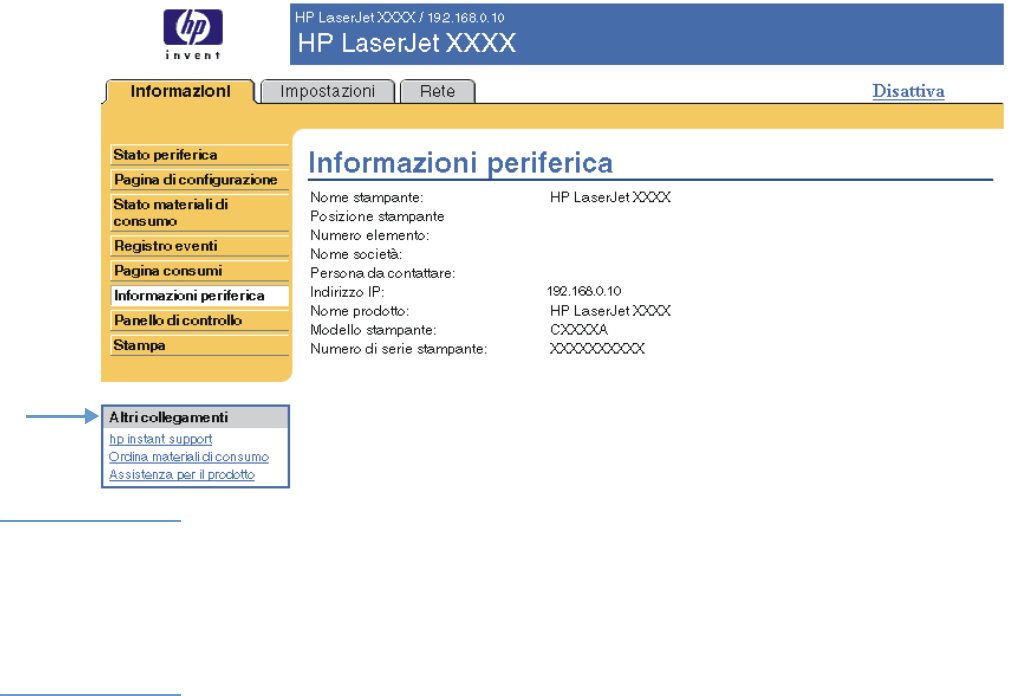 Questi collegamenti vengono visualizzati in tutte le schermate EWS, nella casella Altri