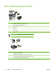 Step 3: Verify the package contents 1 3 4 5 2 1 automatic document feeder (ADF) input tray 2 HP LaserJet 3390/3392 all-in-one 3 power cord 4 fax cord 5 print cartridge NOTE The USB and network cables are not included.