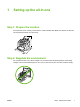 Step 7: Install the output bin support Insert the pin on one side of the support into the hole in the all-in-one. Flex the pin on the other side inward, and insert it into the hole. Step 8: Install the automatic document feeder (ADF) input tray ENWW 1. Align the two tabs on the input tray with the two grooves in the ADF lid. 2. Slide the tray into the grooves until the tray snaps into place.