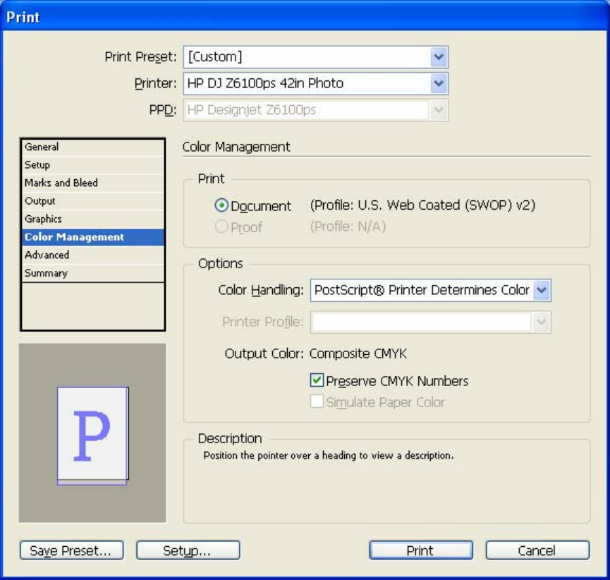 HP Designjet Z6100 Printing Guide [PS Driver] - How to reprint a job with color consistency [Adobe InDesign CS2 - Windows]