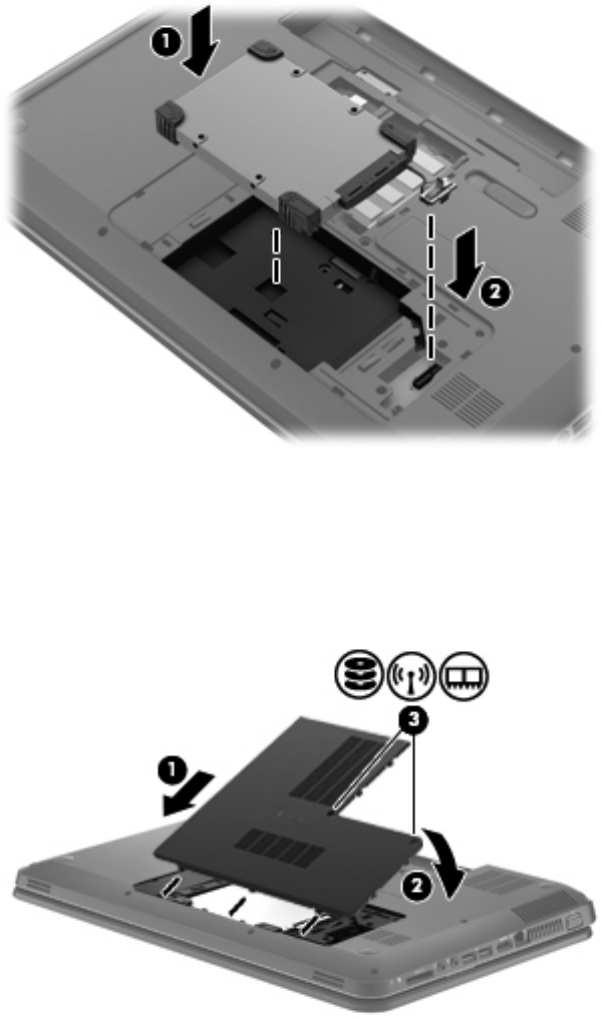 2. Zarovnejte výstupky (1) na servisním krytu s výřezy na počítači.
