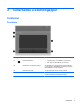 2 Ismerkedés a számítógéppel Felülnézet Érintőtábla Részegység (1) Leírás Érintőtábla jelzőfénye ● Folyamatos fény: az érintőtábla ki van kapcsolva. ● Nem világít: az érintőtábla be van kapcsolva. (2) Érintőtábla be- és kikapcsoló gombja Az érintőtábla be- és kikapcsolására szolgál. Koppintson gyorsan duplán az érintőtábla be- és kikapcsoló gombjára az érintőtábla be- és kikapcsolásához. (3) Érintőtábla bal gombja Az egér bal gombjával azonos módon működik.