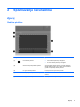 Komponenta Opis (9) Lučka trdega diska ● Utripajoča bela: trdi disk je v uporabi. (10) Lučka za vklop ● Bela: računalnik je vklopljen. ● Utripa belo: računalnik je v stanju spanja. ● Ne sveti: računalnik je izklopljen ali v stanju mirovanja. Zaslon Komponenta Opis (1) Anteni WLAN (2)* Pošiljata in prejemata brezžične signale za komuniciranje z brezžičnimi krajevnimi omrežji (WLAN). (2) Lučka spletne kamere Sveti: Spletna kamera je vklopljena.