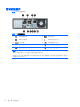 1 產品功能 標準配置功能 HP Compaq 纖薄桌上型電腦的功能可能依機型而有所不同。若要完整列出安裝於電腦上的硬體及軟 體,請執行診斷公用程式(只包含在某些電腦機型中)。 附註: 纖薄桌上型電腦也可以當成直立式電腦使用。如需詳細資訊,請參閱本指南中位於第 13 頁的 以直立方向使用纖薄桌上型電腦。 圖示 1-1 纖薄桌上型電腦配置 標準配置功能 1