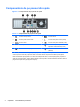 Tabelul 1-2 Componentele cititorului de carduri Nr. Slot Media 1 xD ● xD-Picture Card (xD) 2 MicroSD ● MicroSD (T-Flash) ● MicroSDHC 3 Indicator luminos de activitate a cititorului de carduri 4 SD/MMC+/miniSD ● Secure Digital (SD) ● MiniSDHC ● ● Secure Digital High Capacity (SDHC) ● MultiMediaCard (MMC) MultiMediaCard 4.0 (MMC Plus) ● MiniSD ● MultiMediaCard 4.