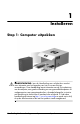 Installeren Stap 6: Computer inschakelen en Windows-besturingssysteem installeren bij uw computer een ander besturingssysteem dan Windows XP ✎ Als Professional/Home is meegeleverd, zijn bepaalde delen van deze documentatie niet van toepassing. Raadpleeg de documentatie en de online Help bij het besturingssysteem voor instructies. Ä LET OP: Voeg geen optionele hardware of apparatuur van andere leveranciers aan de computer toe voordat het besturingssysteem volledig is geïnstalleerd.