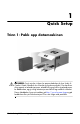 1 Quick Setup Trinn 1: Pakk opp datamaskinen Å ADVARSEL: For å minske risikoen for personskade bør du lese Safety & Comfort Guide (Håndbok for sikkerhet og brukervennlighet). Den beskriver riktig oppsett av arbeidsstasjonen, arbeidsstilling og helse- og arbeidsvaner for databrukere, og gir viktig informasjon om elektrisk og mekanisk sikkerhet. Denne håndboken finnes på webben på http://www.hp.com/ergo og på harddisken eller på Dokumentasjon-CDen som fulgte med produktet.