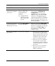 Résolution des problèmes Problème L’affichage de la date et de l’heure de l’ordinateur est incorrect. Cause La pile de l’horloge temps réel (RTC) doit éventuellement être remplacée. ✎ Le fait de brancher l’ordinateur sur une prise secteur prolonge la durée de vie de la pile HTR. Les touches de direction La touche Verr num est du pavé numérique ne peut-être enclenchée. déplacent pas le curseur. Vous observez de faibles performances. Le processeur est chaud.