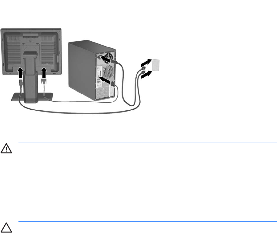 Stecken Sie die Netzkabel und das Monitorkabel wie auf der Abbildung gezeigt ein. Schalten Sie den