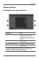 Részegységek Részegység Leírás 3 Be- vagy kikapcsolja a vezeték nélküli eszközöket, de nem létesít vezeték nélküli kapcsolatot. Vezeték nélküli eszközök gombja* nélküli kapcsolat csak működő, vezeték nélküli hálózat ✎ Vezeték esetén hozható létre. * Ez a táblázat az alapbeállításokat tartalmazza. Az alapértelmezett beállítások módosításáról további információt a Súgó és támogatás segédprogram felhasználói útmutatóiban talál.