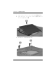 メ モ リ モ ジ ュ ールの追加または交換 拡張 メ モ リ モジ ュ ール ス ロ ッ ト への メ モ リ モジ ュ ールの追加 拡張メモリ モジュール スロットにメモリ モジュールを追加したり、メ モリ モジュールを交換したりするには、以下の手順で操作します。 1. 必要なデータを保存します。 2. コンピュータの電源を切り、ディスプレイを閉じます。 コンピュータの電源が切れているか、ハイバネーション状態なのか 分からない場合は、電源ボタンを押していったんコンピュータの電 源を入れてから、オペレーティング システムをシャットダウンして ください。 1–2 3. コンピュータに接続されているすべての外付けデバイスを取り外し ます。 4. 電源コンセントから電源コードを抜きます。 5. コンピュータを裏返して安定した平らな場所に置きます。 6.