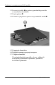 Dodajanje in zamenjava pomnilniških modulov 12. Poravnajte jezičke 1 na pokrovu pomnilniškega modula z zarezami na računalniku. 13. Zaprite pokrov 2. 14. Zatisnite vijak pokrova prostora za pomnilniški modul 3. 15. Zamenjajte akumulator. 16. Priključite zunanje napajanje in naprave. 17. Vklopite računalnik. Če računalnik prikaže sporočilo, da se je velikost ali konfiguracija pomnilnika spremenila, pritisnite f1, da shranite spremembe.