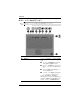 各部の名称 名称 1 機能 電源ボタン コンピュータの状態によって次のように機能 します ■ コンピュータの電源が切れているときに ボタンを押すと、電源が入ります ■ コンピュータの電源が入っているときに 押すと、ハイバネーション状態になりま す ■ スタンバイ状態のときに短く押すと、ス タンバイが終了します ■ ハイバネーション状態のときに短く押す と、ハイバネーションが終了します コンピュータが応答せず、Windowsのシャット ダウン手順を実行できないときは、電源ボタン を5秒以上押したままにすると、コンピュータ の電源が切れます 2 ディスプレイ スイッチ コンピュータの電源が入ったままディスプレ イを閉じたときに、スタンバイを起動します 3 無線ボタン* 無線機能をオンまたはオフにしますが、無線接 続は作成されません 無線ネットワークがすでにセットアップされている ✎ 無線接続を確立するには、 必要があります *この表ではデフォルト設定について説明しています。デフォルト設定の変更については、 [ヘルプとサポート センター ]からユーザ ガイドを参照してください