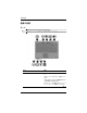 各部の名称 ポ イ ン テ ィ ング デバイ ス タ ッ チパ ッ ド (一部のモデルのみ) 名称 機能 1 タッチパッド* ポインタを移動したり、画面上のアイテムを選 択またはアクティブにしたりします。スクロー ルやダブルクリックなど、その他のマウス機能 も実行するように設定できます 2 左のタッチパッド ボタン* 外付けマウスの左のボタンと同様に機能しま す 3 タッチパッドのスクロール ゾーン 画面を上下にスクロールします 4 右のタッチパッド ボタン* 外付けマウスの右のボタンと同様に機能しま す *この表ではデフォルト設定について説明しています。タッチパッドの設定を表示したり変 更したりするには、[スタート]→[コントロール パネル]→[プリンタとその他のハードウェ ア]→[マウス]の順に選択します。 1–6 ノ ー ト ブ ッ ク コ ン ピ ュ ー タ の各部