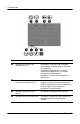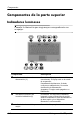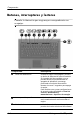Componentes Componente Descripción 4 Enciende o apaga la funcionalidad inalámbrica, pero no crea una conexión inalámbrica. Botón de conexiones inalámbricas* establecer una conexión inalámbrica, primero debe ser ✎ Para configurada una red inalámbrica. 5 Botón de presentación Inicia el recurso de presentación. 6 Botón de silencio Silencia y restaura el sonido del equipo.