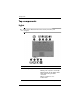 Components Top components Lights to the illustration that most closely matches your ✎ Refer computer. Component Description 1 On: The computer is on. Blinking: The computer is in standby. Blinking rapidly: An AC adapter with a higher power rating should be connected. Off: The computer is off or in hibernation.