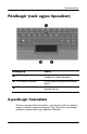Mutatóeszközök Részegység Leírás 3 Érintőtábla görgetőterülete* Függőleges görgetést tesz lehetővé. 4 Érintőtábla jobb gombja* A külső egér jobb oldali gombjának feladatát látja el. *Ez a táblázat az alapbeállításokat tartalmazza. Az érintőtábla beállításainak megtekintéséhez vagy módosításához válassza a Start > Vezérlőpult > Nyomtatók és más hardverek > Egér lehetőséget. Az érintőtábla beállításainak ismertetését lásd: „Az érintőtábla beállításainak megadása”.