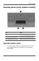 Kazalne naprave Del Opis 3 področje za drsenje na Za drsenje navzgor in navzdol. sledilni ploščici* 4 desni gumb sledilne Deluje kot desni gumb zunanje miške. ploščice* *Tabela opisuje privzete nastavitve. Če si želite ogledati nastavitve sledilne ploščice in jih spremeniti, izberite Start > Control Panel (Nadzorna plošča) > Printers and Other Hardware (Tiskalniki in druga strojna oprema) > Mouse (Miška). Podrobnosti o sledilni ploščici najdete v razdelku »Nastavljanje možnosti sledilne ploščice«.