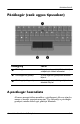 Mutatóeszközök Részegység Leírás 3 Érintőtábla görgetőterülete* Függőleges görgetést tesz lehetővé. 4 Érintőtábla jobb gombja* A külső egér jobb oldali gombjának feladatát látja el. *Ez a táblázat az alapbeállításokat tartalmazza. Az érintőtábla beállításainak megtekintéséhez és módosításához kattintson a Start menü Vezérlőpult parancsára, a Hardver és hang hivatkozásra, végül pedig az Egér hivatkozásra.