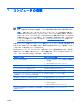 セキュリティの対象 使用するセキュリティ機能 コンピュータの不正な移動 セキュリティ ロック ケーブル用スロット(別売のセキュリテ ィ ロック ケーブルとともに使用) *[Computer Setup]は、コンピュータの電源投入時または再起動時に f10 キーを押してアクセスするユーティリティであり、 Windows が起動する前に機能するユーティリティです。[Computer Setup]の項目間を移動したり項目を選択したりするに は、コンピュータのキーを使用する必要があります。 2 第 1 章 コンピュータの保護 JAWW