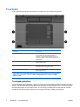 Touchpad In de volgende illustratie en tabel wordt het touchpad voor de computer beschreven. Onderdeel Beschrijving (1) Touchpad* Hiermee kunt u de aanwijzer (cursor) verplaatsen en onderdelen op het scherm selecteren of activeren. U kunt andere muisfuncties voor dit onderdeel instellen, zoals schuiven, selecteren en dubbelklikken. (2) Linkerknop van het touchpad* Deze knop heeft dezelfde functie als de linkerknop op een externe muis.
