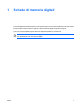 1 Schede di memoria digitali Le schede digitali opzionali permettono un'archiviazione sicura e una facile condivisione dei dati. Queste schede vengono spesso usate nei palmari, nelle fotocamere digitali e negli altri computer. Lo slot per supporti digitali supporta la Secure Digital (SD) Memory Card formati. ATTENZIONE Per evitare di danneggiare la scheda digitale o il computer, non inserire alcun tipo di adattatore nello slot supporti digitali.