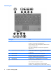 Felső részegységek Mutatóeszközök Részegység Leírás (1) Pöcökegér bal gombja Úgy működik, mint egy külső egér bal gombja. (2) Pöcökegér Az egérmutató mozgatására és képernyőelemek kiválasztására szolgál. (3) Pöcökegér jobb gombja Úgy működik, mint egy külső egér jobb gombja. *Ez a táblázat a gyári alapbeállításokat írja le. A mutatóeszköz beállításainak megtekintéséhez és módosításához válassza a Start > Vezérlőpult > Hardver és hang > Egér lehetőséget. 2 1.
