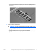 b. Pak de rand van de geheugenmodule (2) en trek de module voorzichtig uit het compartiment. (Bewaar de geheugenmodule na verwijdering in een antistatische verpakking om deze te beschermen.) 12. U plaatst als volgt een geheugenmodule: VOORZICHTIG Let op dat u de geheugenmodule niet beschadigt door deze te buigen. NLWW a. Breng de inkeping (1) in de geheugenmodule op één lijn met het nokje van het geheugenmoduleslot. b.