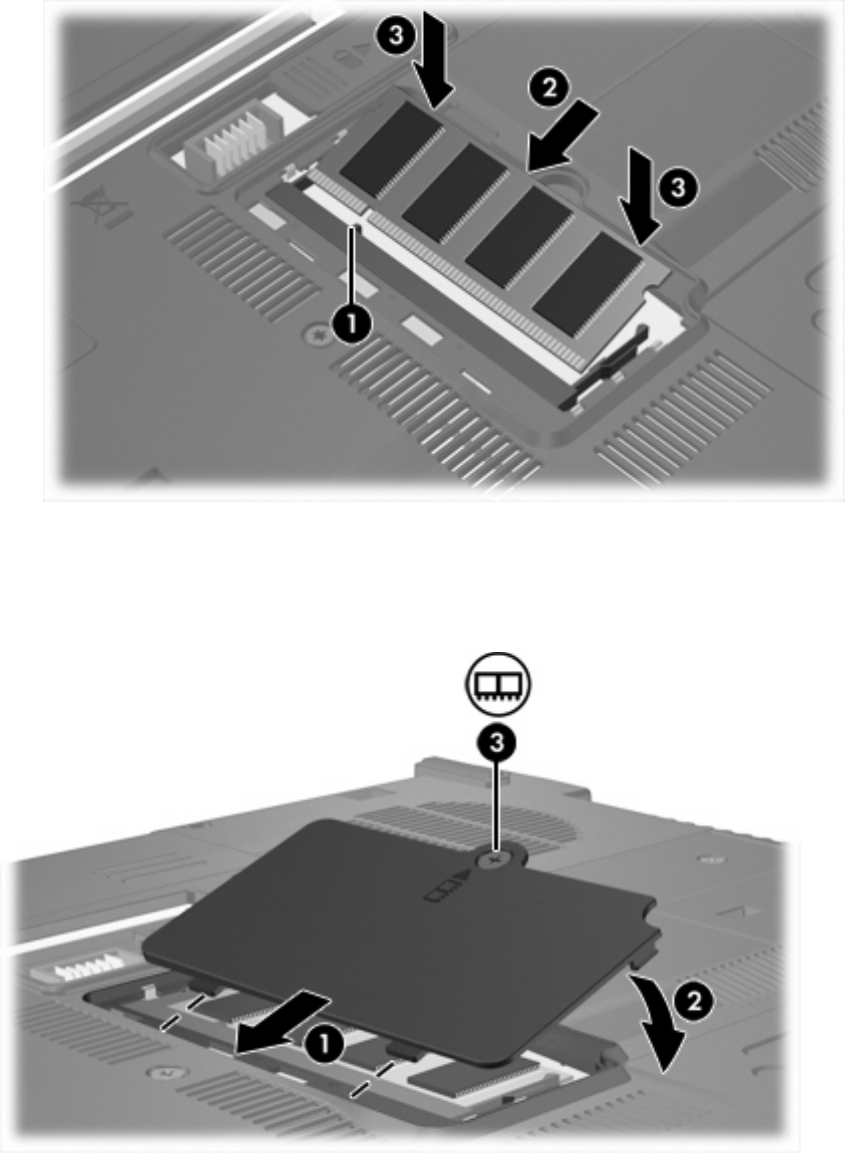 11. Aseta muistimoduulipaikan kannen kielekkeet (1) tietokoneessa olevia koloja vasten.