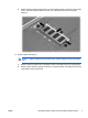 b. Bellek modülünü kenarından (2) kavrayın ve modülü bellek modülü yuvasından yavaşça çekip çıkarın. (Çıkarılan bellek modülünü korumak için, elektrostatik korumalı bir kap içinde saklayın.) 10. Bellek modülünü takmak için: DİKKAT Bellek modülünün hasar görmemesi için, bellek modülünü bükmemeye dikkat edin. TRWW a. Bellek modülünün çentikli kenarını (1) bellek modülü yuvasındaki şeritle aynı hizaya getirin. b.