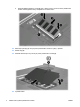 10. Posuňte 4 uvolňovací západky klávesnice a uvolněte klávesnici. 11. Opatrně nadzvedněte horní hranu klávesnice a naklánějte ji, dokud se nepoloží na podpěru počítače. 12. Vytáhněte paměťový modul do zásuvky paměťového modulu: a. CSWW Odtáhněte pojistné svorky (1) na obou stranách paměťového modulu. (Paměťový modul se nakloní nahoru.