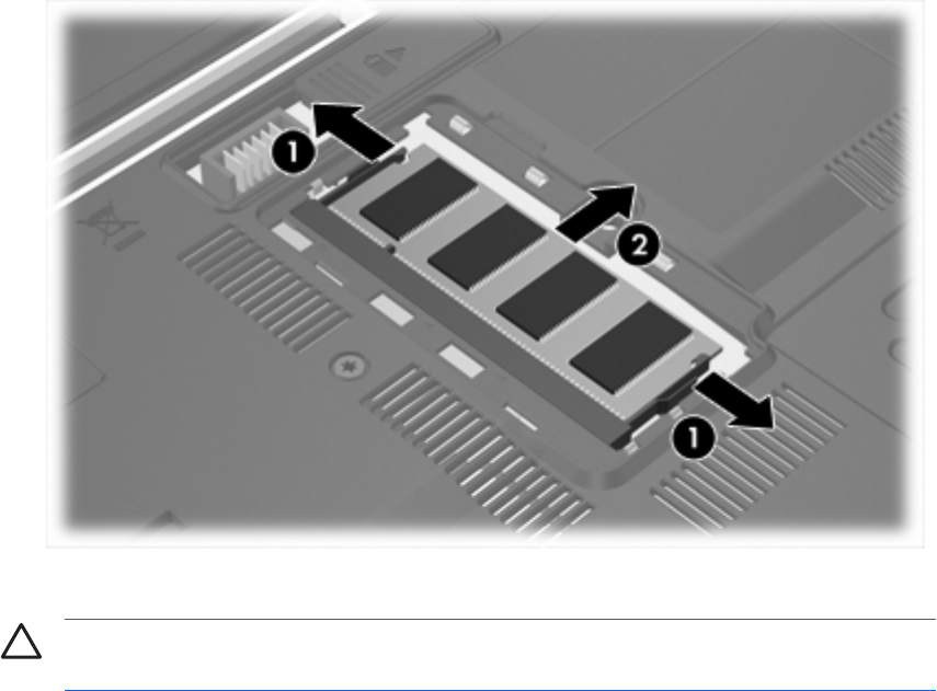 b. Pak de geheugenmodule aan de rand vast (2) en trek de module voorzichtig uit het