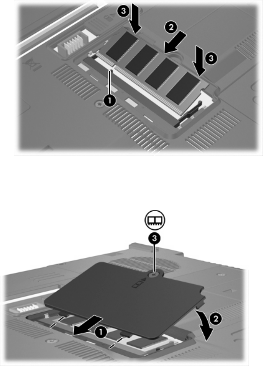 12. Plaats het afdekplaatje van het geheugenmodulecompartiment met de lipjes (1) in de uitsparingen