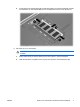 10. Skyv på de fire tastaturutløserne for å løsne tastaturet. 11. Løft den øverste delen av tastaturet forsiktig, og vipp det bakover helt til det hviler på håndleddstøtten på datamaskinen. 12. Slik tar du minnemodulen ut av minnemodulsporet: a. NOWW Løsne festeklipsene (1) på hver side av minnemodulen. (Minnemodulen vippes oppover.