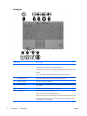 Onderdeel Beschrijving (8) Hiermee kunt u zich bij Windows aanmelden met een vingerafdruk en hoeft u geen wachtwoord op te geven. Vingerafdruklezer *In deze tabel worden de fabrieksinstellingen beschreven. Zie voor informatie over het wijzigen van de fabrieksinstellingen de handleidingen onder Help en ondersteuning. Toetsen NLWW Onderdeel Beschrijving (1) esc-toets Als u op deze toets drukt in combinatie met de fn-toets, wordt de systeeminformatie weergegeven.