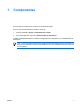 1 Componentes En este capítulo se explican las funciones de hardware del equipo. Para ver una lista del hardware instalado en el equipo: 1. Seleccione Iniciar > Equipo > Propiedades del sistema. 2. En el panel izquierdo, haga clic en Administrador de dispositivos. También puede añadir hardware o modificar configuraciones de dispositivos con el Administrador de dispositivos. Nota Los componentes incluidos con el equipo pueden variar según la región y el modelo.