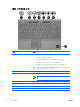 부품 (8) 설명 지문 인식기 암호 대신 지문을 사용하여 Windows 에 로그온할 수 있습니다. *이 표에서는 초기 설정에 대해 설명합니다. 초기 설정 변경에 대한 자세한 내용은 도움말 및 지원 센터의 사용 설명서를 참조하십시오. 키 부품 설명 (1) esc 키 fn 키와 함께 누르면 시스템 정보가 표시됩니다. (2) fn 키 기능 키 또는 esc 키와 함께 누르면 자주 사용하는 시스템 기능이 실행됩니 다.. (3) Windows 로고 키 Microsoft Windows 시작 메뉴를 표시합니다. (4) Windows 응용프로그램 키 포인터가 위치하고 있는 항목에 대한 바로 가기 메뉴를 표시합니다. (5) 내장 숫자 키패드 키 외장 숫자 키패드의 키와 같은 기능을 수행합니다. (6) 기능 키 fn 키와 다른 키를 함께 눌러서 자주 사용하는 시스템 기능을 실행합니다.