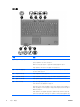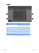 윗면 부품 포인팅 장치 부품 설명 (1) 왼쪽 포인팅 스틱 버튼 외장 마우스의 왼쪽 버튼과 같은 기능을 수행합니 다. (2) 포인팅 스틱 포인터를 움직여서 화면에 표시된 항목을 선택하거 나 활성화합니다. (3) 오른쪽 포인팅 스틱 버튼 외장 마우스의 오른쪽 버튼과 같은 기능을 수행합 니다. *이 표에서는 초기 설정에 대해 설명합니다. 포인팅 장치 기본 설정을 확인하거나 변경하려면 시 작 > 제어판 > 프린터 및 기타 하드웨어 > 마우스를 차례로 선택합니다.
