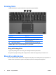 TouchPad I følgende illustration og skema beskrives computerens TouchPad. Komponent Beskrivelse (1) TouchPad* Flytter markøren samt vælger og aktiverer elementer på skærmen. Kan indstilles til at udføre andre musefunktioner, som at rulle, markere og dobbeltklikke. (2) Venstre TouchPad-knap* Fungerer som venstre knap på en ekstern mus. (3) TouchPad-rullezone* Ruller op eller ned. (4) Højre TouchPad-knap* Fungerer som højre knap på en ekstern mus.