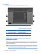 3 HP Quick Launch Buttons Use os botões HP Quick Launch para abrir os programas freqüentemente usados, também chamados aplicativos, no painel de controle do HP Quick Launch Buttons. (1) (2) PTWW Componente Descrição Botão Info Center Inicia o Info Center, que permite a você abrir diversas soluções de software. É possível também reprogramar este botão para executar uma das seguintes ações: Botão Apresentação ● Abrir o recurso de apresentação ou o Menu Q. ● Abrir um editor de e-mail.
