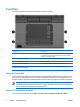 3 HP Quick Launch buttons Use the HP Quick Launch buttons to open frequently used programs, sometimes called applications in the HP Quick Launch Buttons control panel. (1) (2) ENWW Component Description Info Center button Launches Info Center, which enables you to open various software solutions. You can also reprogram this button to perform one of the following actions: Presentation button ● Open presentation feature or the Q Menu. ● Open an e-mail editor.