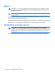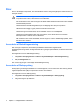 Batteri ADVARSEL! For at mindske potentielle sikkerhedsproblemer må kun det batteri, der fulgte med computeren, et ombytningsbatteri fra HP eller et kompatibelt batteri, der er købt hos HP, anvendes til computeren. FORSIGTIG! Undgå beskadigelse af batteriet ved ikke at udsætte det for høje temperaturer i længere perioder. Hvis en computer ikke skal anvendes eller skal være frakoblet ekstern strøm i mere end to uger, skal du tage batteriet ud og opbevare det separat.