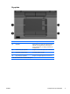 Komponenter på ovansidan Pekdon Komponent Beskrivning (1) Vänster pekdonsknapp Fungerar som vänsterknappen på en extern mus. (2) Styrpinne Flyttar pekaren och väljer eller aktiverar objekt på skärmen. (3) Höger pekdonsknapp Fungerar som högerknappen på en extern mus. *I den här tabellen beskrivs fabriksinställningarna. Om du vill visa och ändra pekdonens inställningar väljer du Start > Kontrollpanelen > Skrivare och annan maskinvara > Mus.