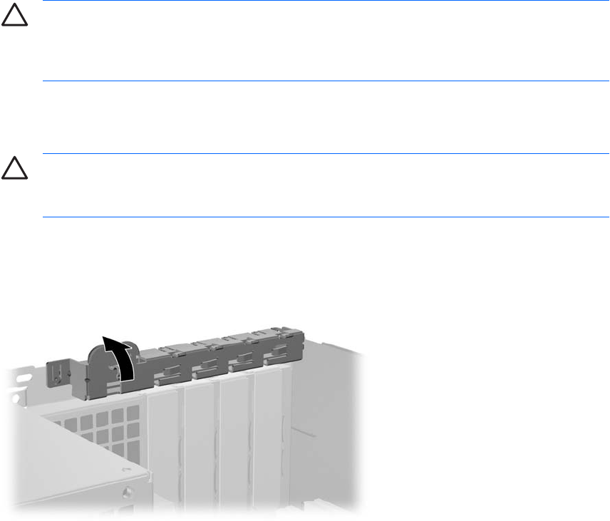 8. Liberte o fecho de retenção da tampa da ranhura que prende as tampas das ranhuras PCI,