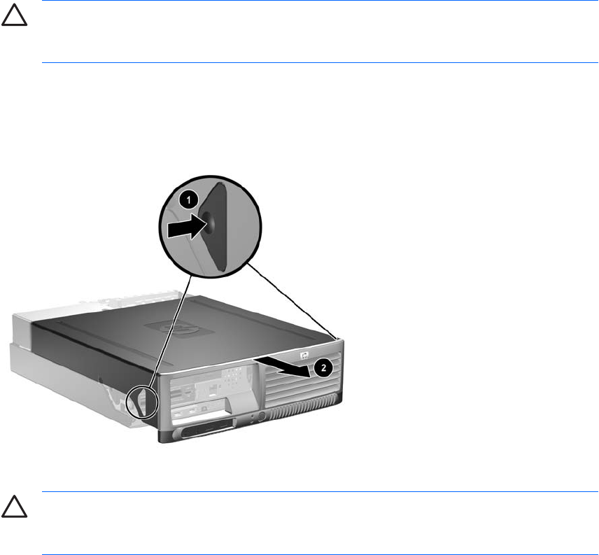 6. กดปุมที่ดานซายและดานขวาของคอมพิวเตอร (1) จากนั้นเลื่อนฝาครอบมาขางหนาจนกระทั่งสุด (2) และยกฝาครอบ