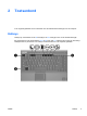 Touchpad In de volgende illustratie en tabel wordt het touchpad voor de computer beschreven. Onderdeel Beschrijving (1) Touchpad* Hiermee kunt u de aanwijzer (cursor) verplaatsen en onderdelen op het scherm selecteren of activeren. U kunt andere muisfuncties voor dit onderdeel instellen, zoals schuiven, selecteren en dubbelklikken. (2) Linkerknop van het touchpad* Deze knop heeft dezelfde functie als de linkerknop op een externe muis.